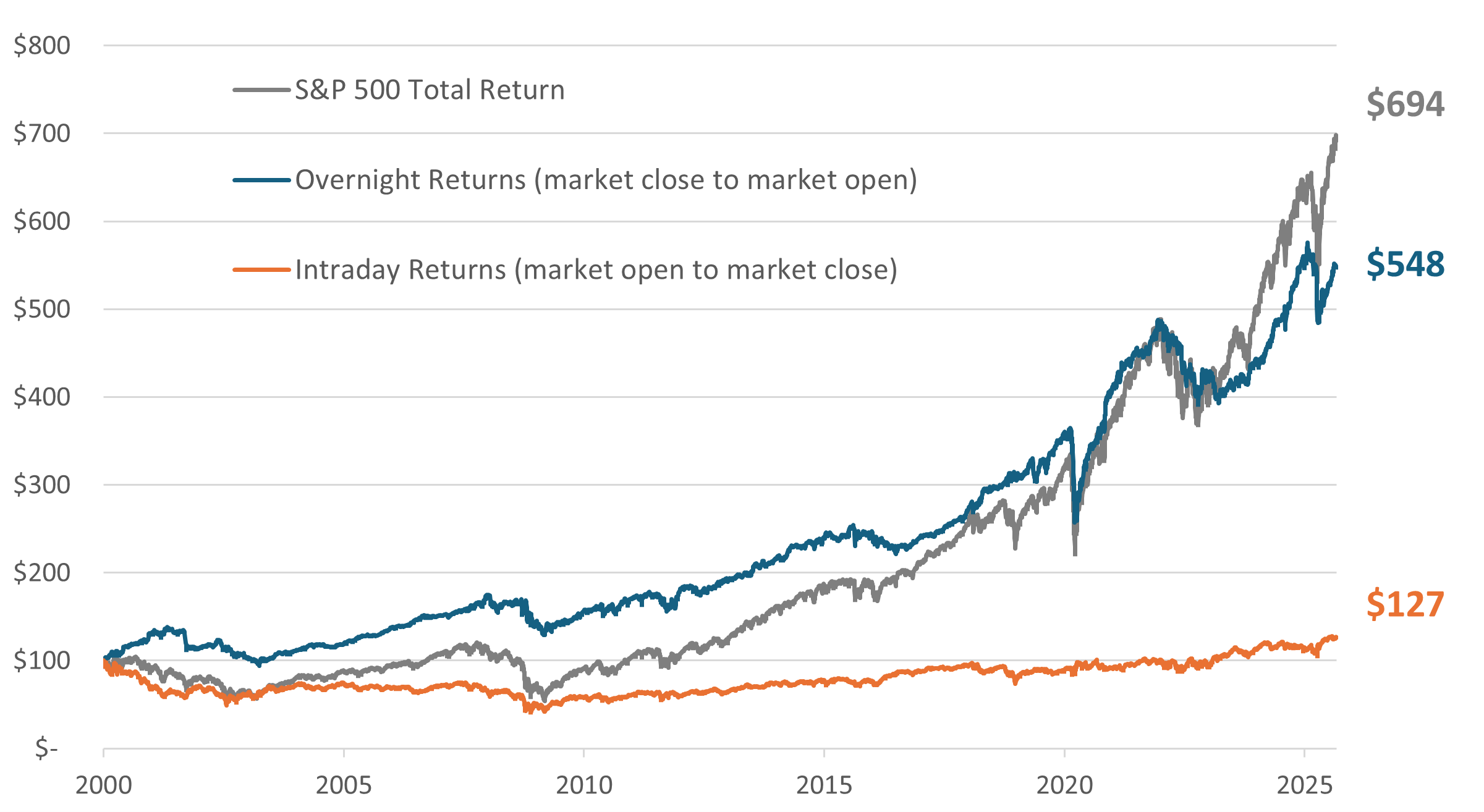 Looking at the bigger picture, overnight returns accounted for the majority of long-term market performance. Since 2000, the S&P 500 has delivered far stronger returns overnight than during the trading day. On average, annualized overnight returns were +7.67%, compared to just +1.41% during standard trading hours[3]. Put another way, a $100 investment in the S&P 500 held only during the day would have grown to about $127, while the same investment held only overnight would have grown to about $548 (Figure 1, 2).
