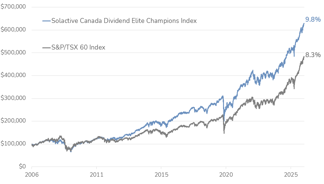 Index Outperformance vs. S&P/TSX 60 with lower volatility*Based on the total return of the Solactive Canada Dividend Elite Champions Index (SDLCACT) vs. S&P/TSX 60 Index. Since May 8, 2006, as at December 31, 2025. SDLCACT data prior to December 31, 2024, is hypothetical back-tested data using actual historical market data. Source: S&P Dow Jones Indices, Solactive AG, Bloomberg, Hamilton ETFs
