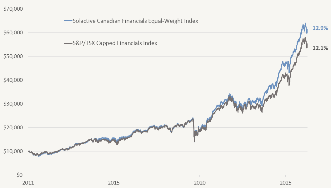 Index outperformance vs. S&P/TSX Capped Financials Index*From April 29, 2011, to March 31, 2026. The Solactive Canadian Financials Equal-Weight Index has outperformed the S&P/TSX Capped Financials Equal-Weight Index. It is not a projection of future index performance, nor does it reflect potential returns on investments in the Fund. Solactive Canadian Financials Equal-Weight Index performance data from April 29, 2011 to December 31, 2024 is hypothetical back-tested data using actual historical market data. Source: Bloomberg, Solactive.